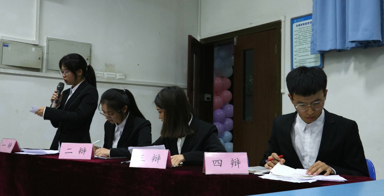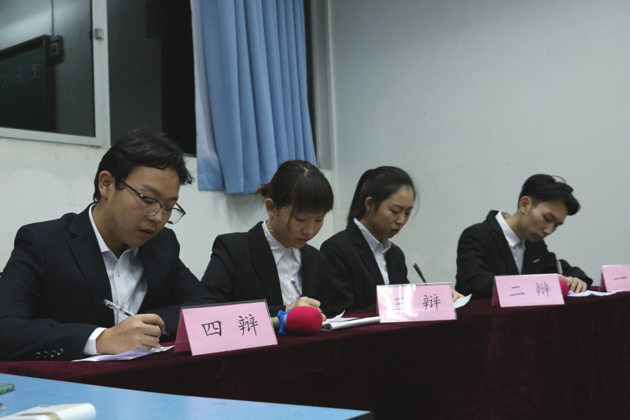 而在辩论环节更为激烈,双方由先正方后反方的顺序交替进行,在这一环节他们口若悬河,据理力争,滔滔不绝,他们犀利的口才,精彩的对决辩出了风格,辩出了精彩。在最后的总结陈词阶段,由先反方后正方的顺序,双方四辩都从多方面剖析辩题,点明了比赛中对方的漏洞失误,升华了己方主题。