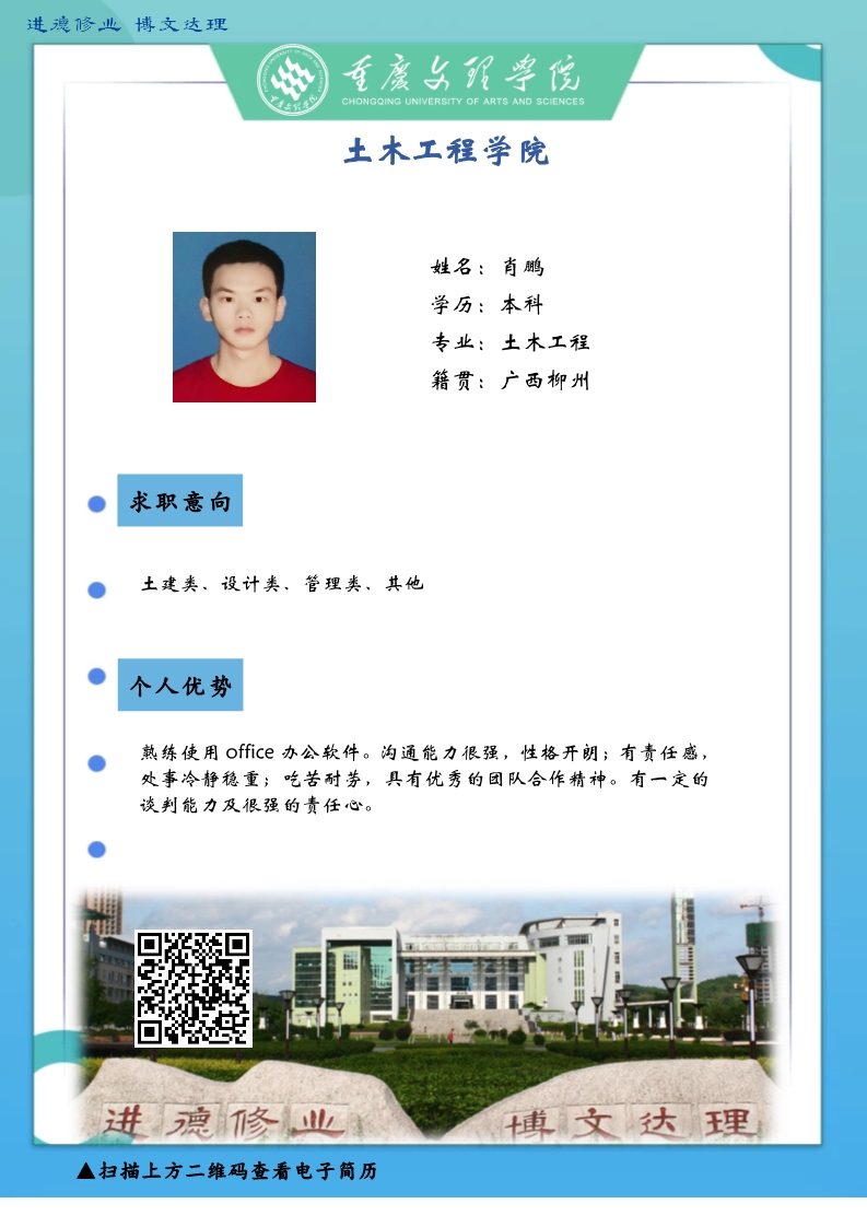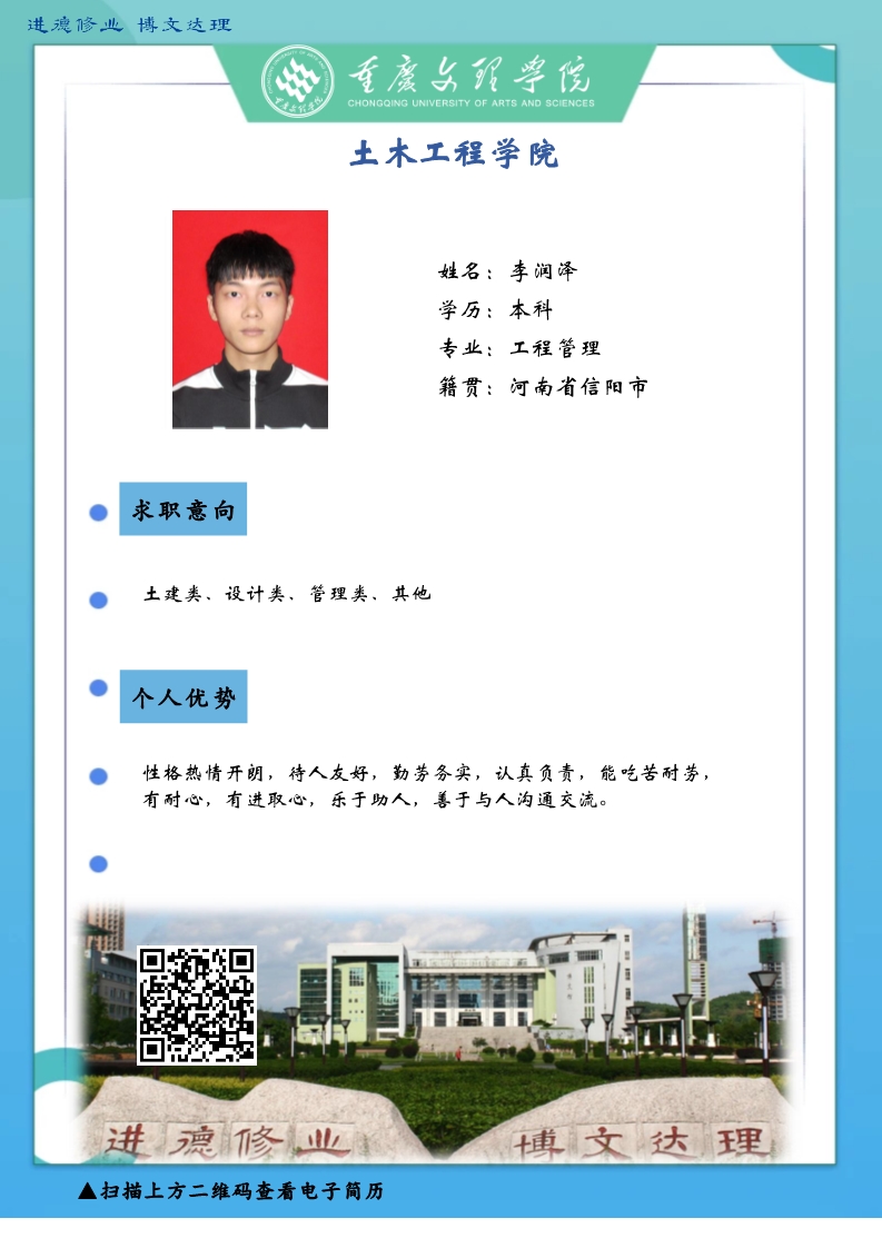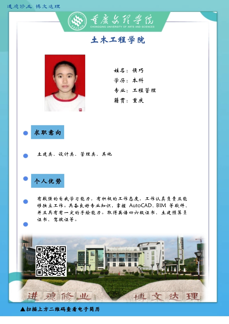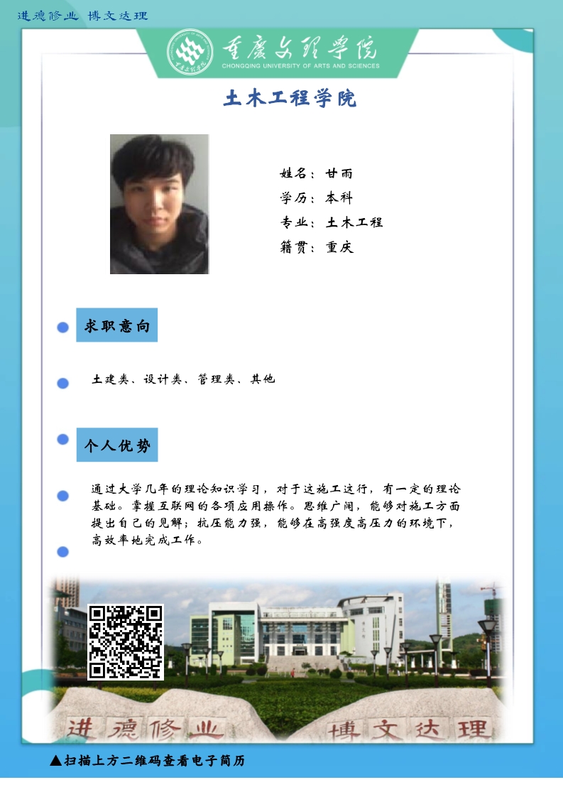 更是坚韧务实肯干,厚土承乾坤,众木支天下。线下招聘活动困难重重,不能当面向您推荐优秀人才,员工也不能当面向您自我介绍,特借此平台,把一些优秀毕业生信息线上发布,如果您或您的朋友有需求,请联系我们,说明单位名称、岗位基本信息和联系方式,我们会第一时间把员工简历呈上。待疫情过后,英才良驹助您事业兴旺发达,再展宏图新篇章!