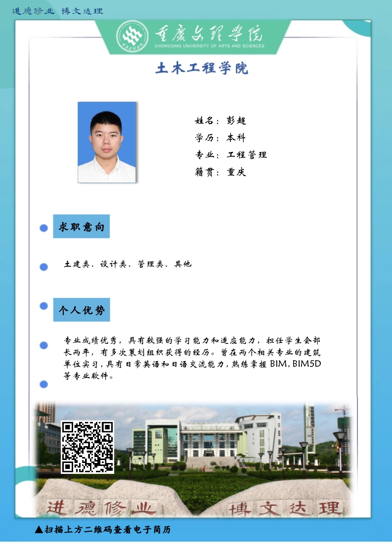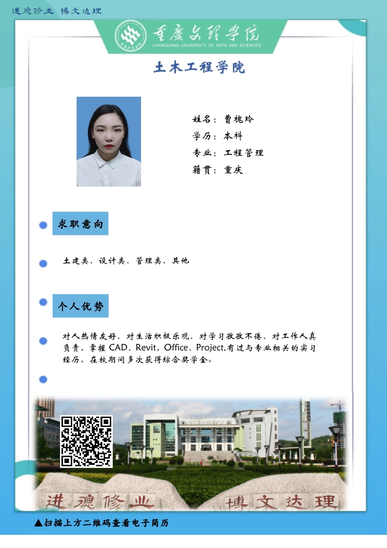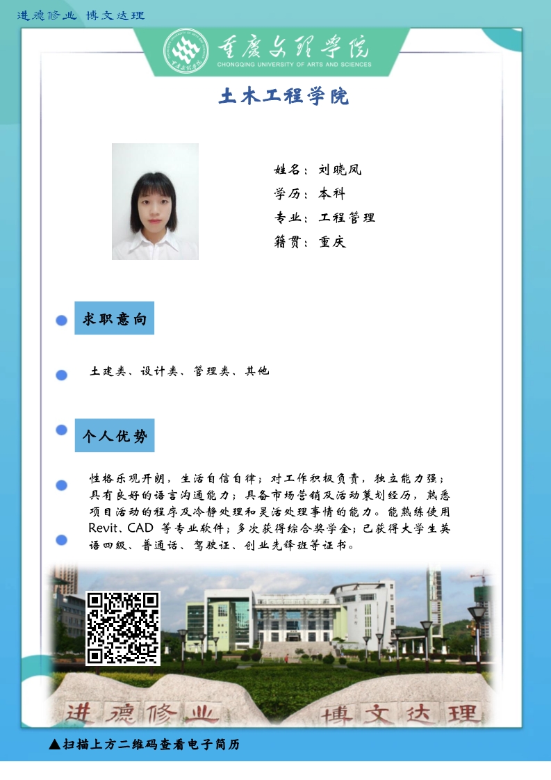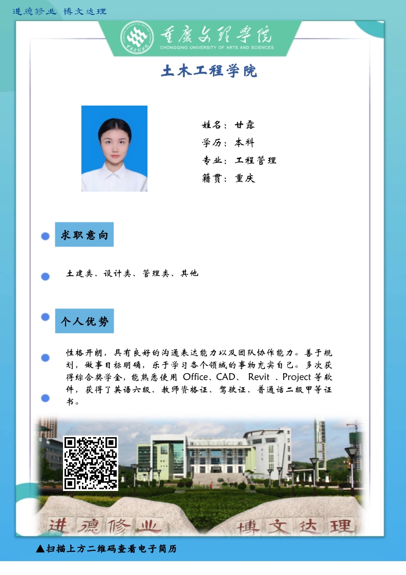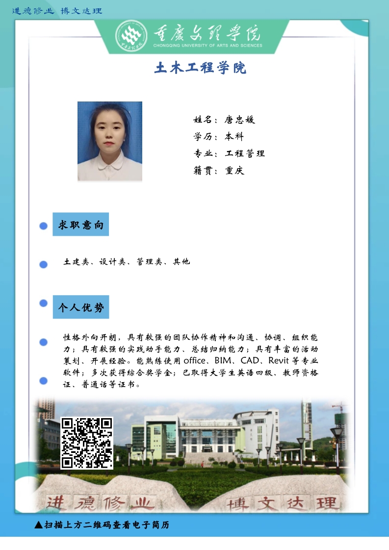 感谢您一直以来对太阳成集团tyc33455cc土木工程公司的支持和帮助。受疫情影响,公司2020届毕业生的就业面临着巨大的挑战。疫情无情人有情,文理人秉承“进德修业博文达理”的校训,困难面前勇向前,厚土承乾坤,众木支天下,土木学子更是坚韧务实肯干。线下招聘活动困难重重,不能当面向您推荐优秀人才,员工也不能当面向您自我介绍,特借此平台,把一些优秀毕业生信息线上发布,如果您或您的朋友有需求,请联系我们,说明单位名称、岗位基本信息和联系方式,我们会第一时间把员工简历呈上。待疫情过后,英才良驹助您事业兴旺发达,再展宏图新篇章!