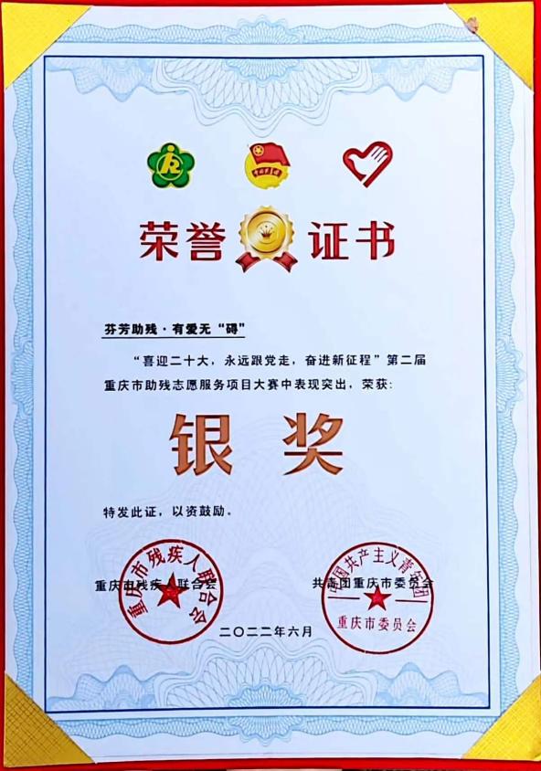 6月9日,由团市委、市残联联合主办的“喜迎二十大、永远跟党走、奋进新征程”第二届重庆市助残志愿服务项目大赛决赛在渝北区举行。本次大赛自4月启动以来,全市共有58个项目参赛,经过层层筛选以及淘汰赛,公司芬芳助残•有爱无“碍”项目团队突出重围进入决赛,以视频+演讲的路演形式将项目完美呈现。在最终的决赛中表现优异,斩获银奖!