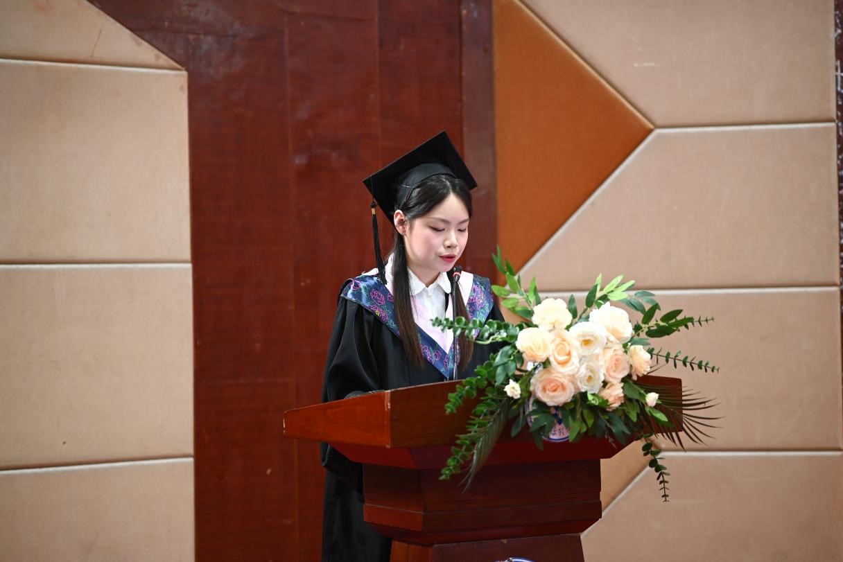 毕业生代表陈妍琳回顾了自己在校期间的成长经历和收获,深切表达对母校、老师的感激之情和对同学、朋友的不舍之情。